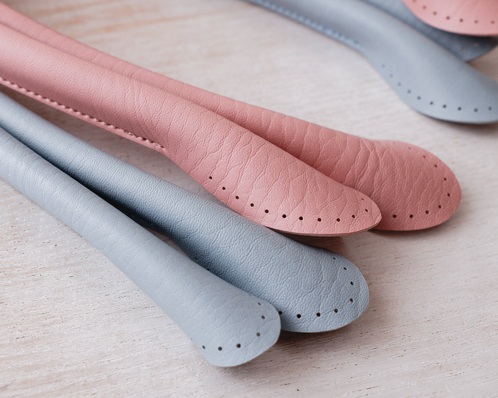 柔らかな色合いのバッグの持ち手。 細口手さげタイプで、手になじみやすい持ち手です。 裏あてがついていて、しっかりとめられる縫い付けタイプです。