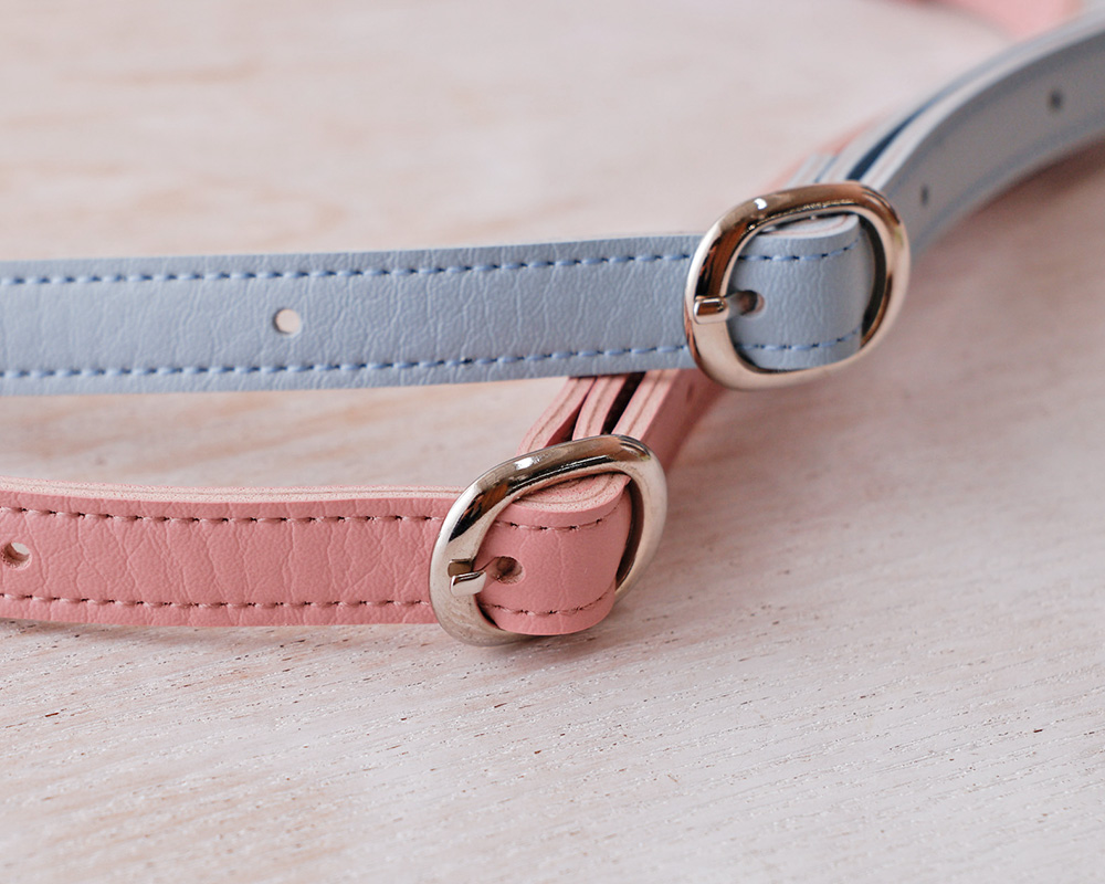 長さ調節はバックルで。鉄砲カンでバッグにつけるタイプです。パステルカラーとシルバーのコンビネーションがすてきです。