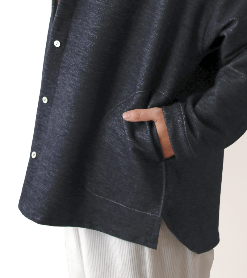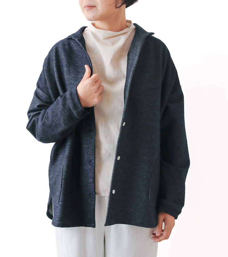 デニムの表情のまま、ニットならではの伸びやかさとやさしさを。肩の力を抜いた着心地が、日常に静かに馴染む一枚です。