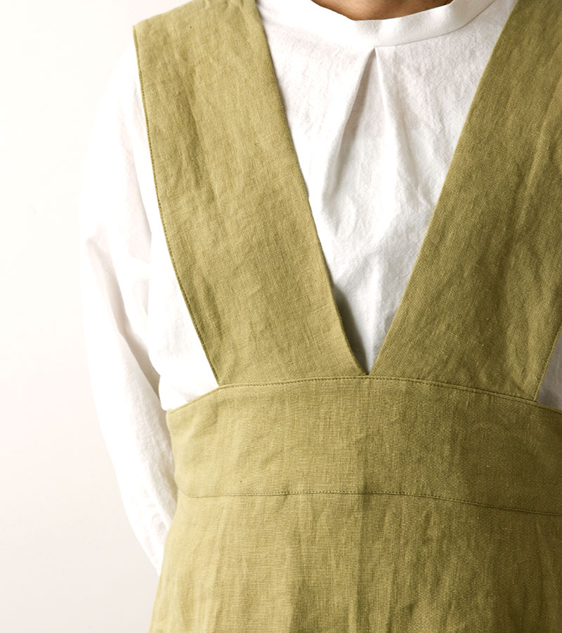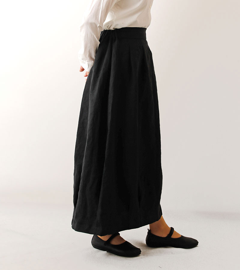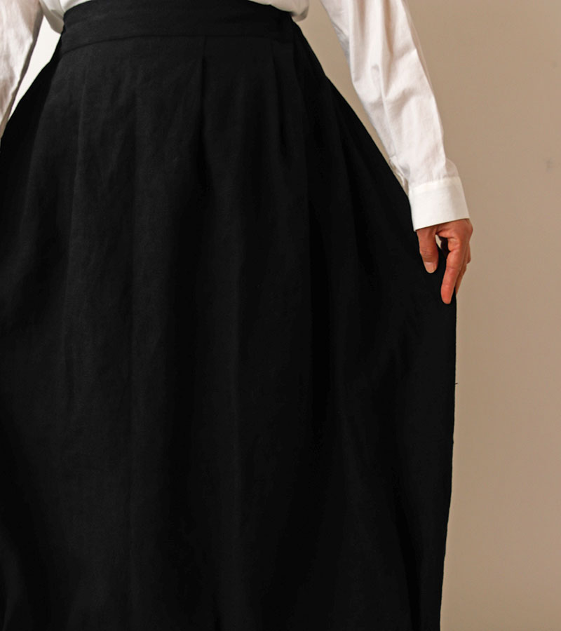 リネン特有のさらりとした質感を残しながら、やわらかさととろみを感じる風合い。落ち感も美しく、動きに合わせて布が自然に沿います。