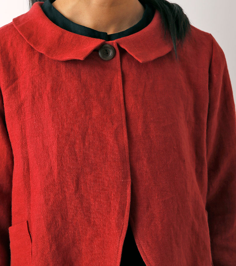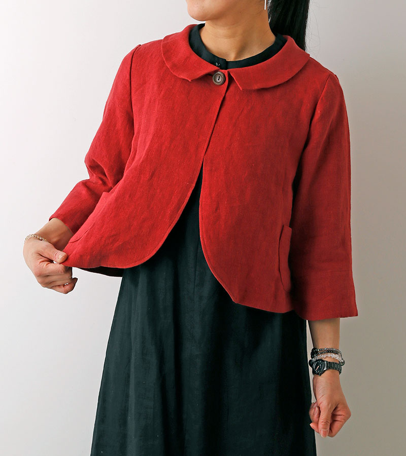 深い赤色のリネンのジャケット。小さめの衿が可愛い。