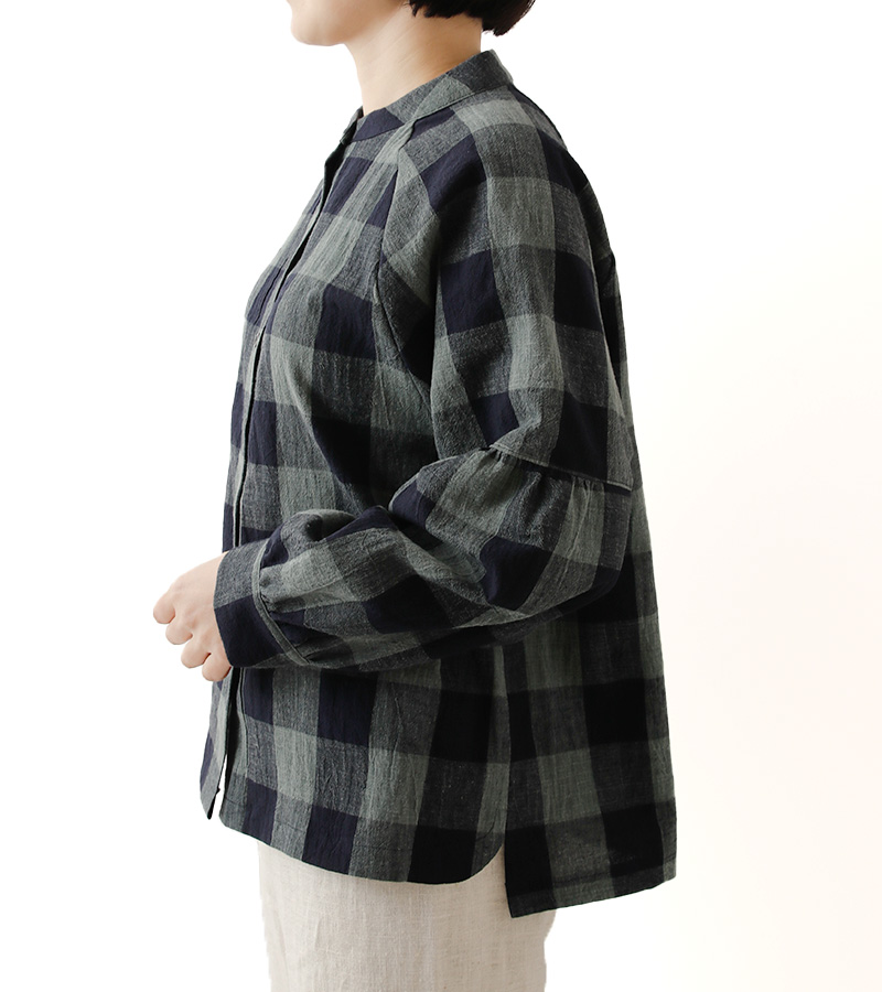 綿と麻を混紡した細番手の糸で織り上げた、先染めのブロックチェック。ストーンウォッシュ加工で味わい深さを増し、軽やかでありながら、素材そのものの質感が感じられる一枚です。
